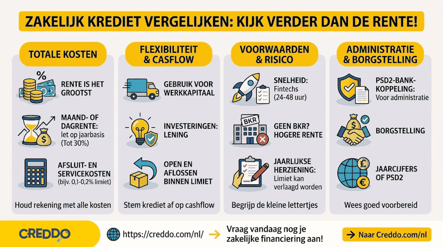 Bij het vergelijken van een zakelijk krediet draait het om meer dan alleen de laagste rente. Het gaat om de totale kosten en de flexibiliteit die past bij jouw cashflow.